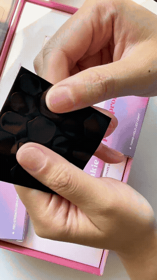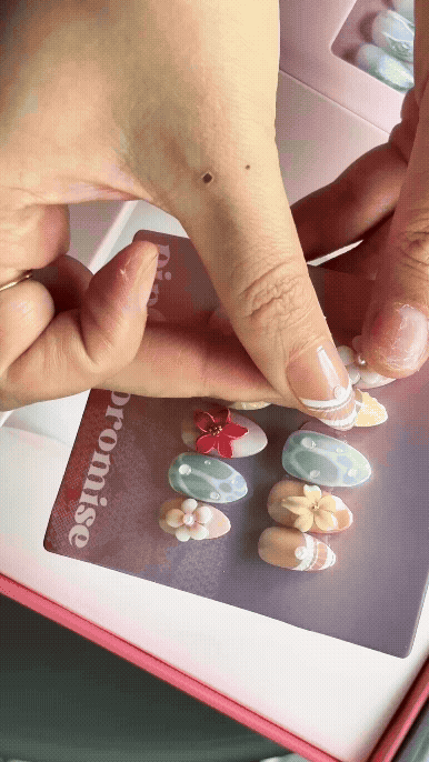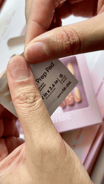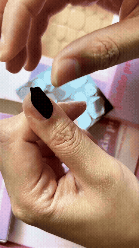 Peel off the protective film to reveal the adhesive. Position the press-on at a 45° angle, then slowly press it down onto your natural nail. Once in place, press firmly across the entire nail.