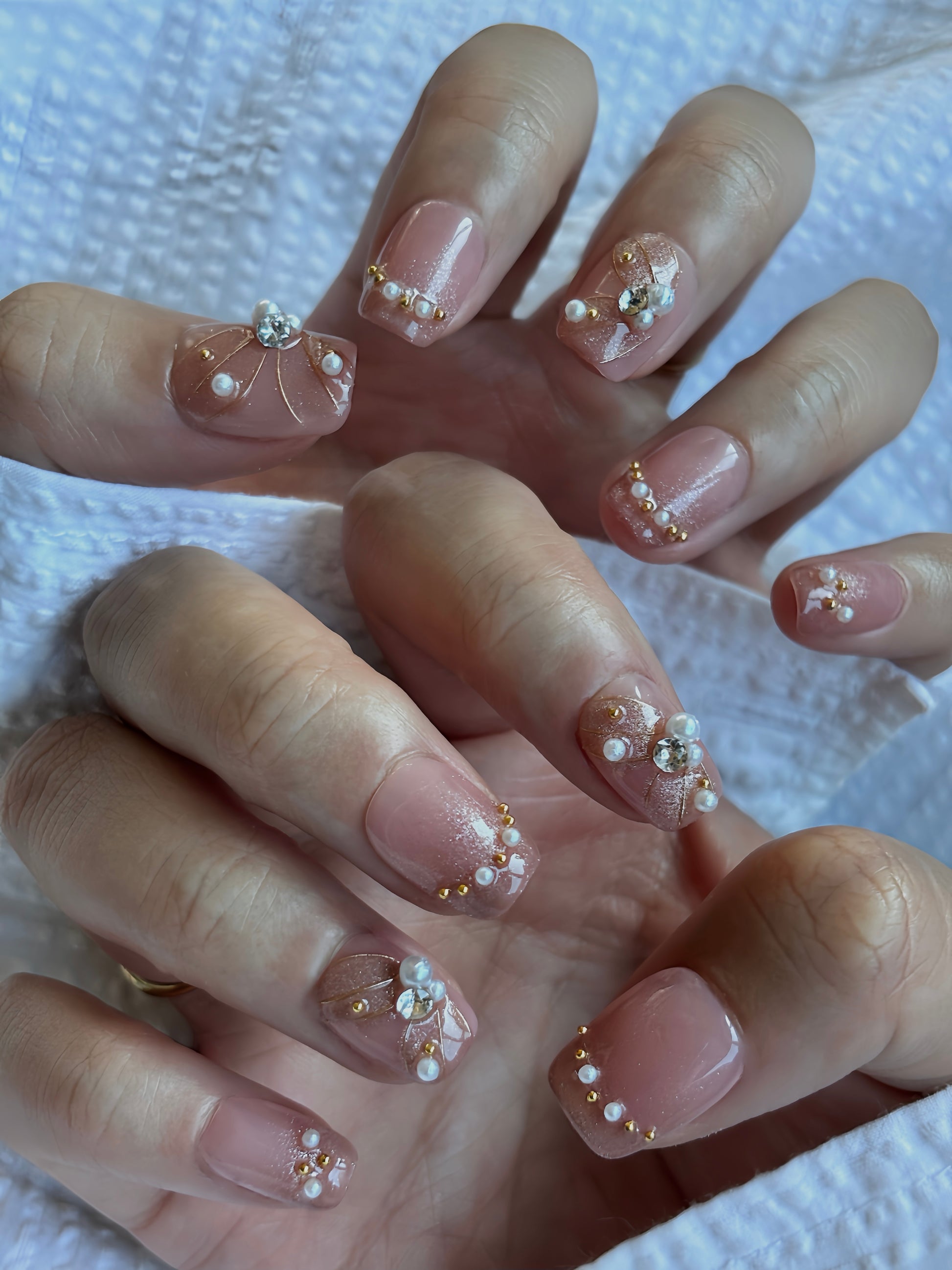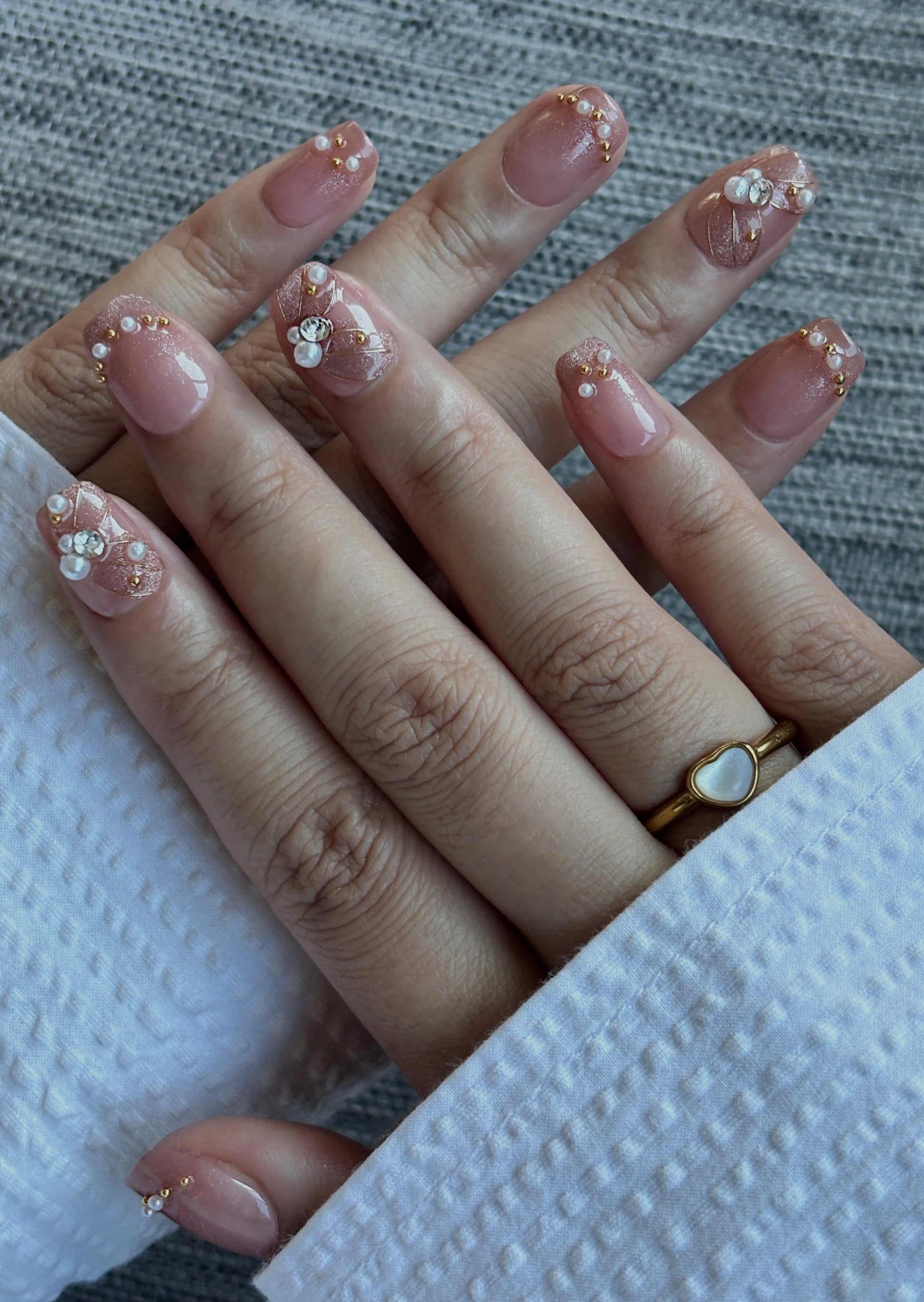 Ashlee blends French tips, soft shimmers, and 3D pearl accents for the perfect elegant summer nails. Don’t let the short length fool you—she’s your new everyday glam. 🦋✨