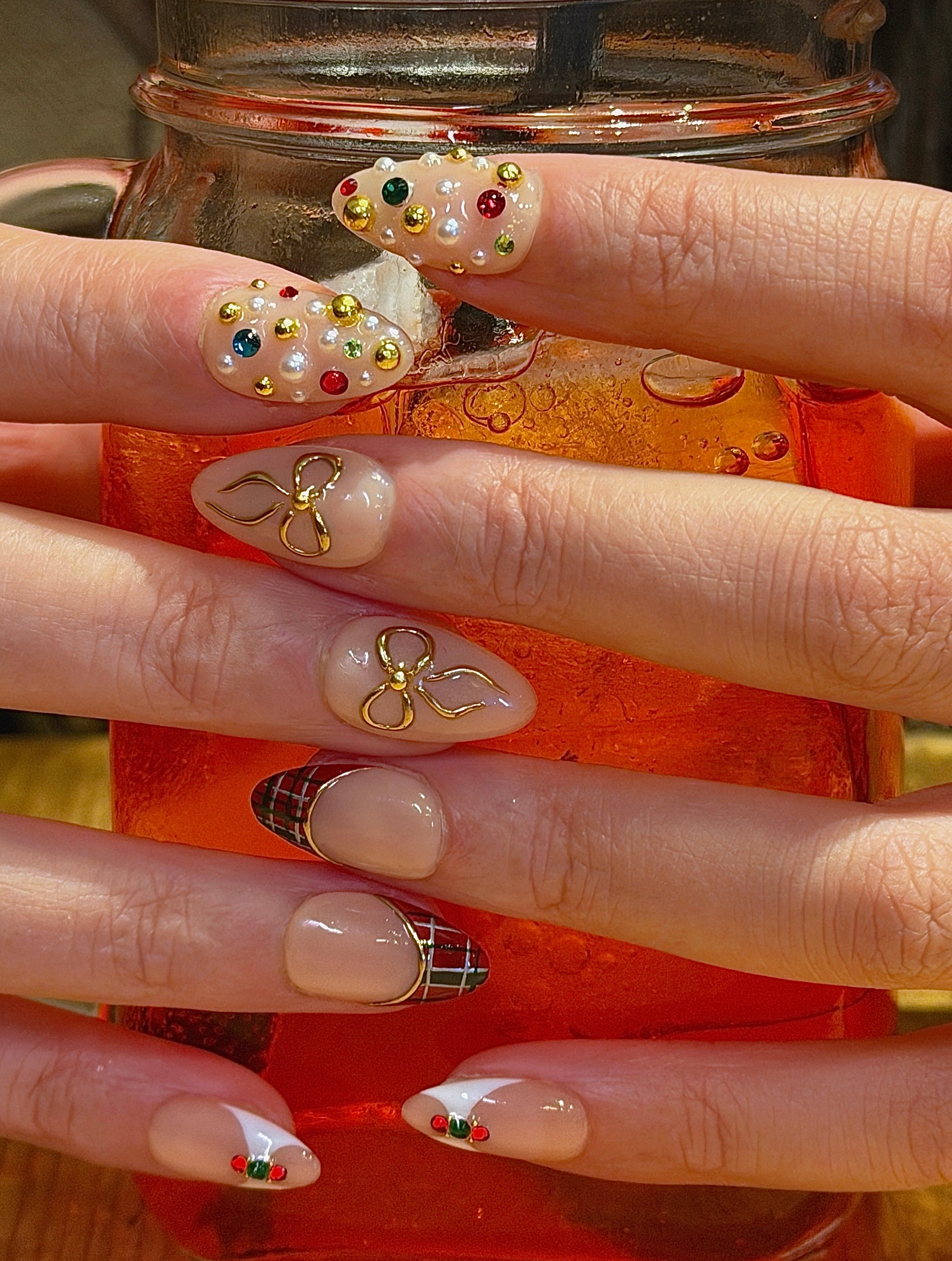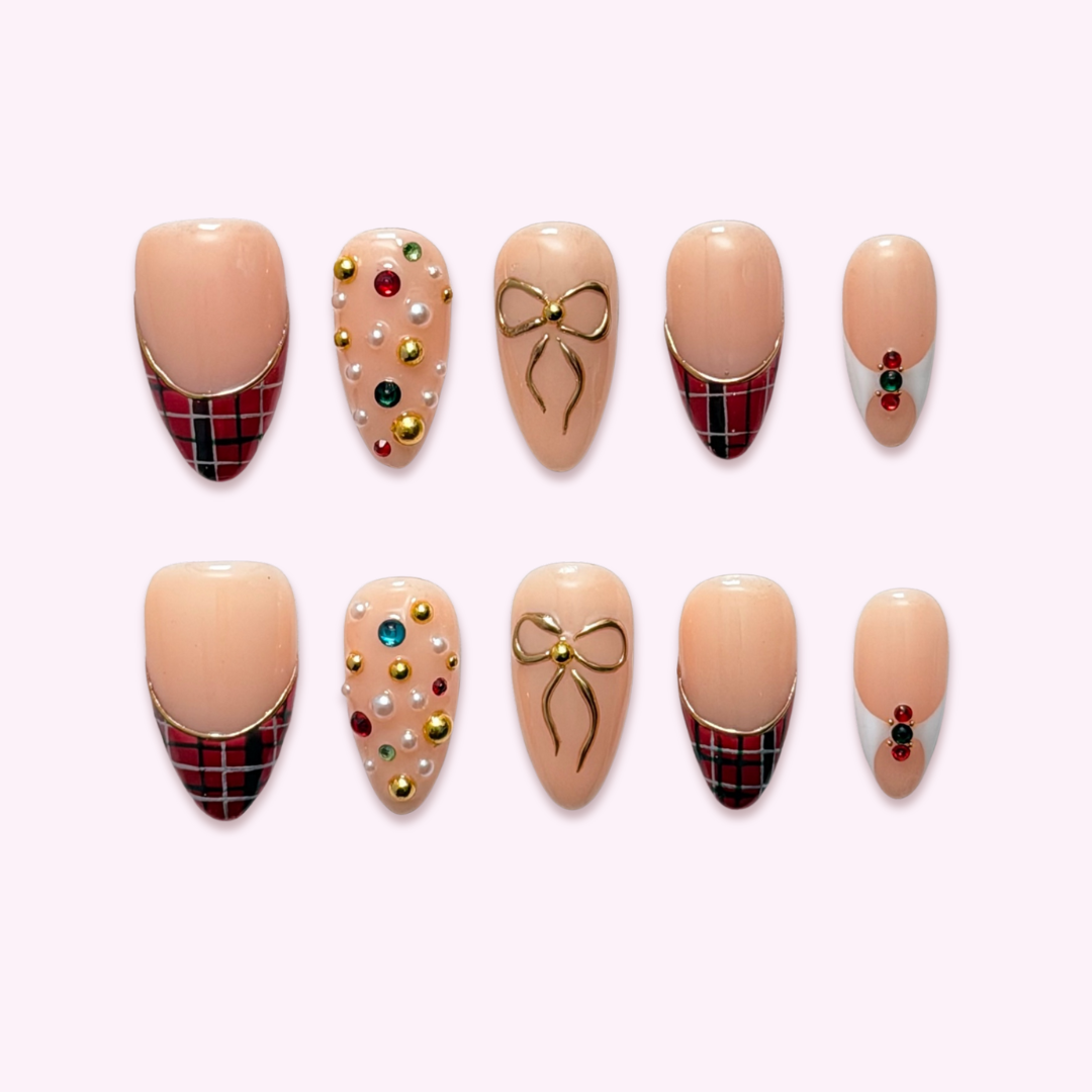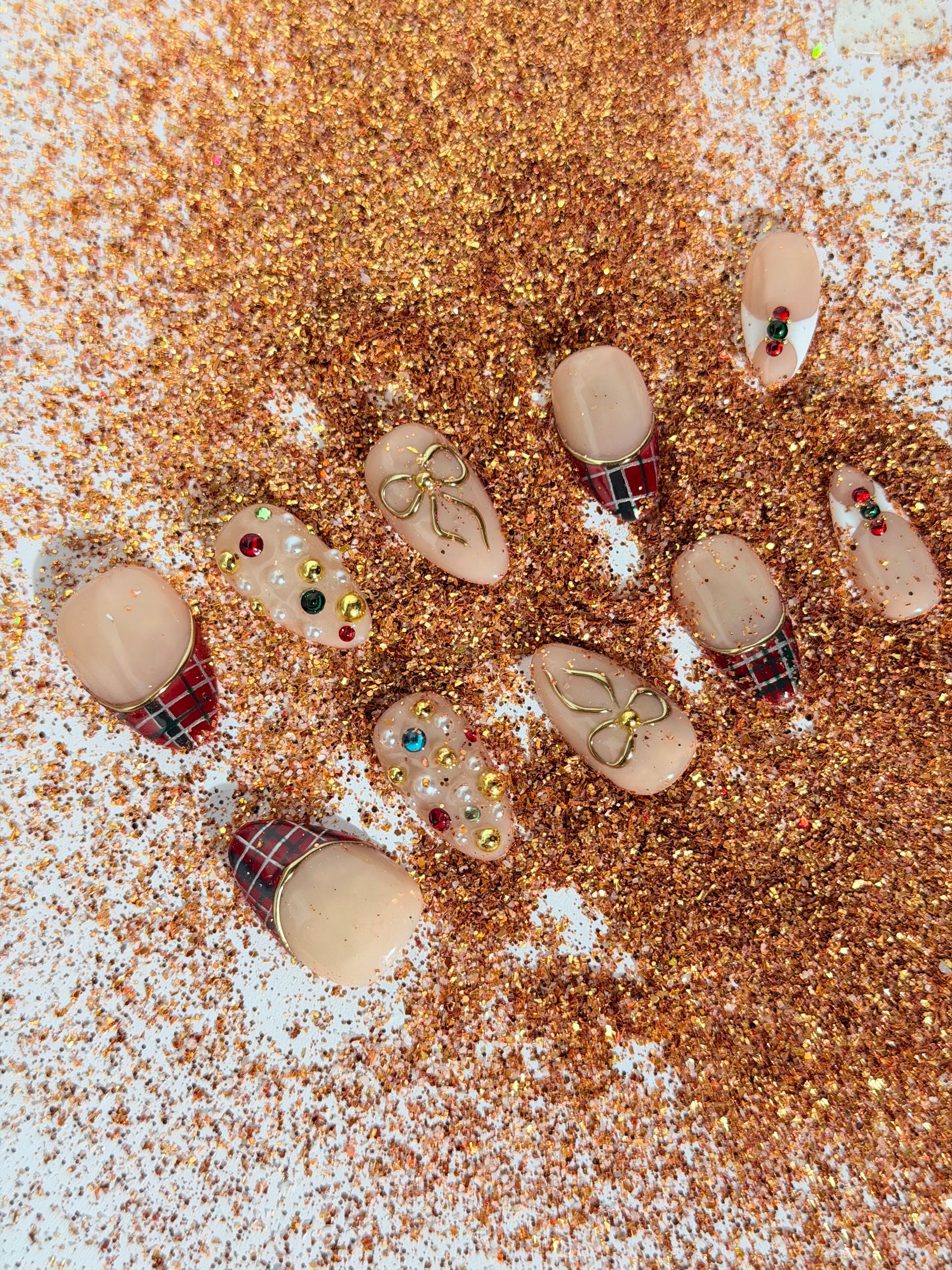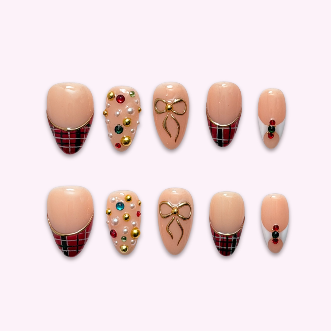 A glossy nude base paired with cranberry plaid French tips, gold trim, and a delicate bow accent. Finished with subtle pearls and jewels for a soft holiday sparkle. Florence is cozy, classic, and effortlessly festive—perfect for everyday winter glam. ✨