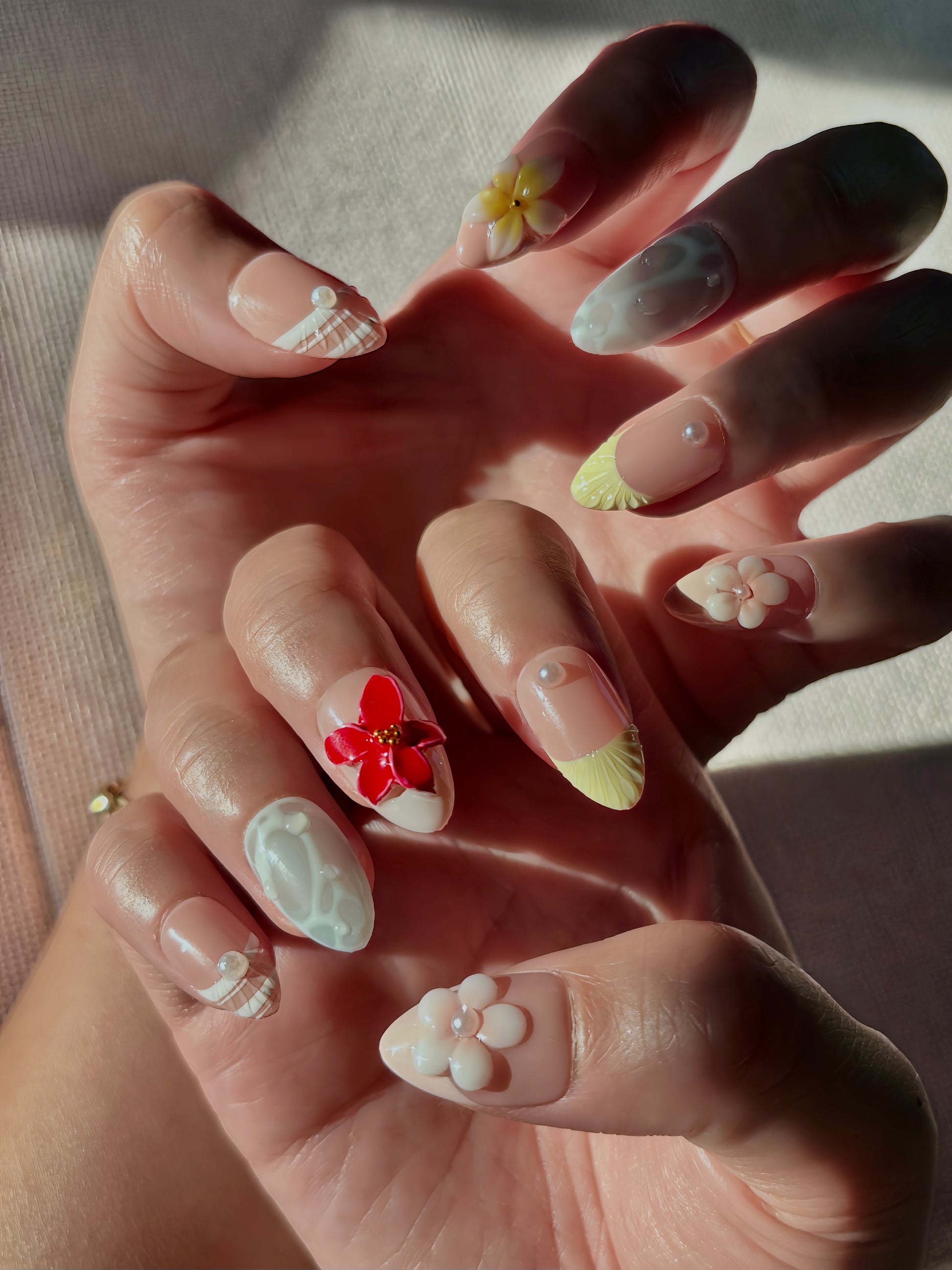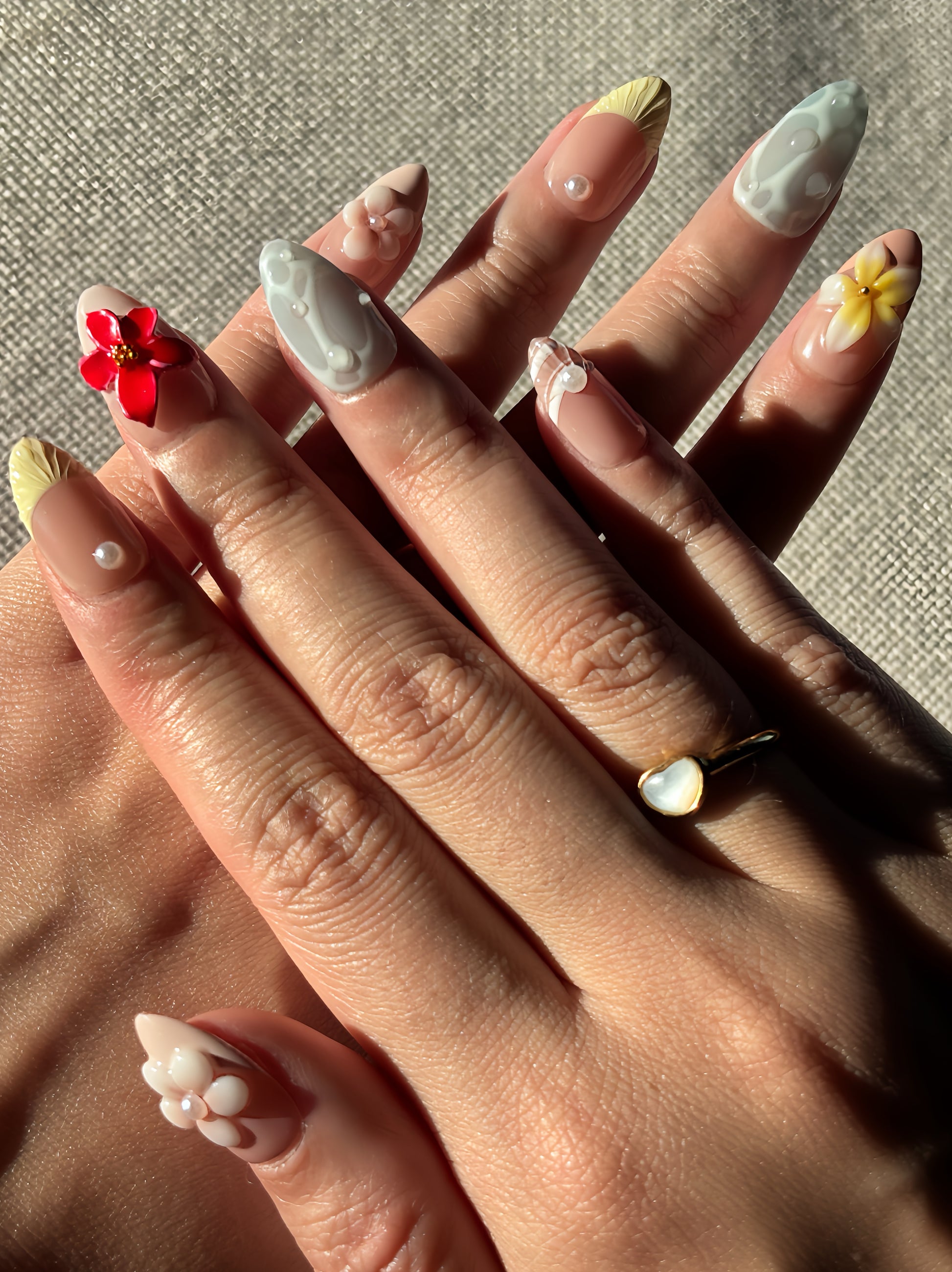 Get island-ready with these short, trendy press-on nails featuring 3D handpainted floral designs, seashell textures, and pearl accents. Perfect for summer, this tropical-inspired set gives you a salon look without the salon time.