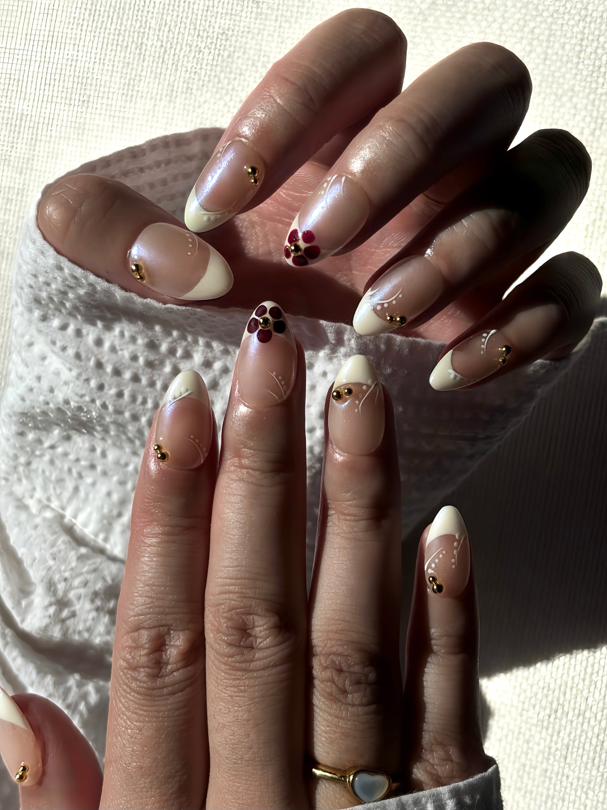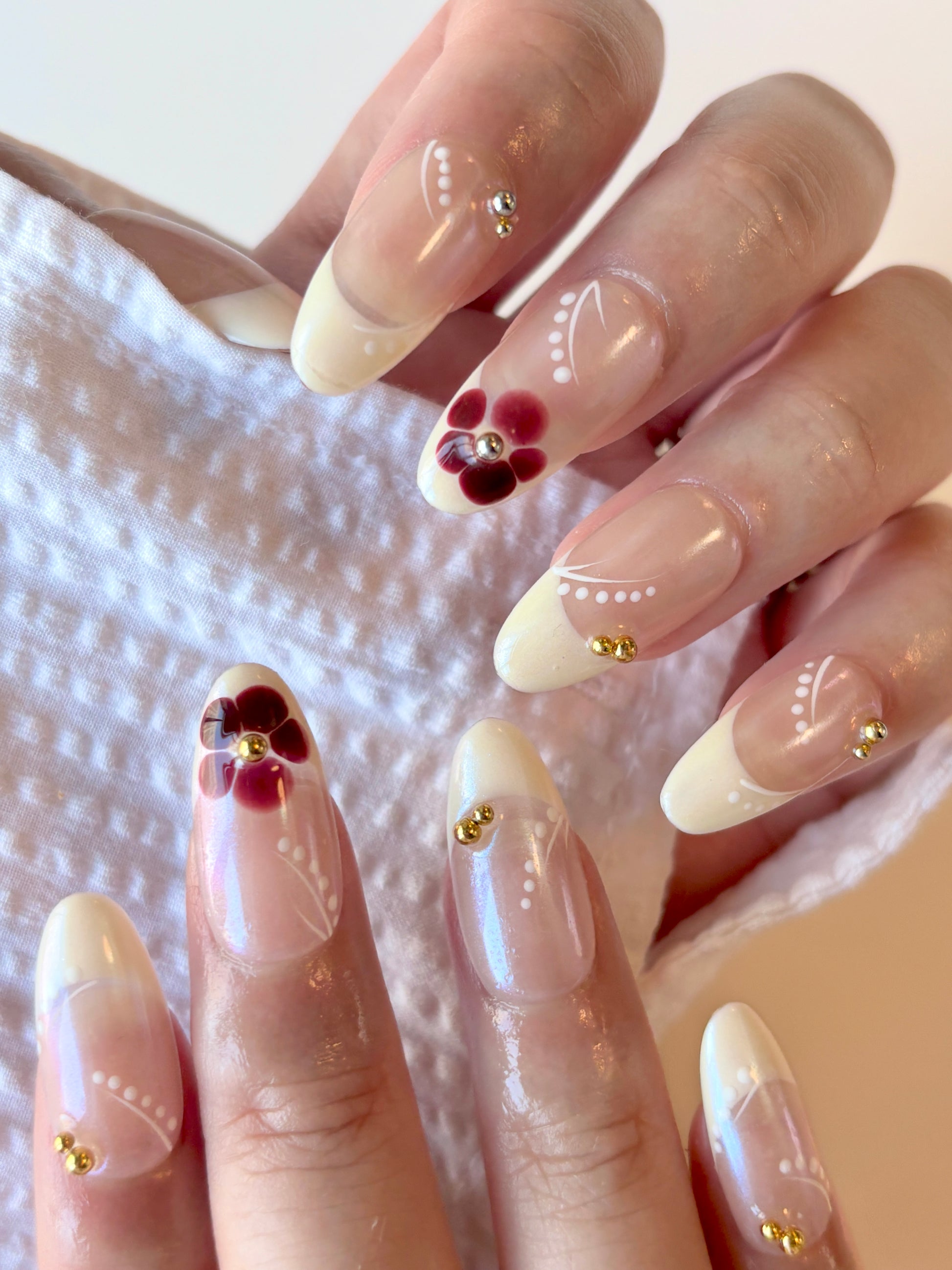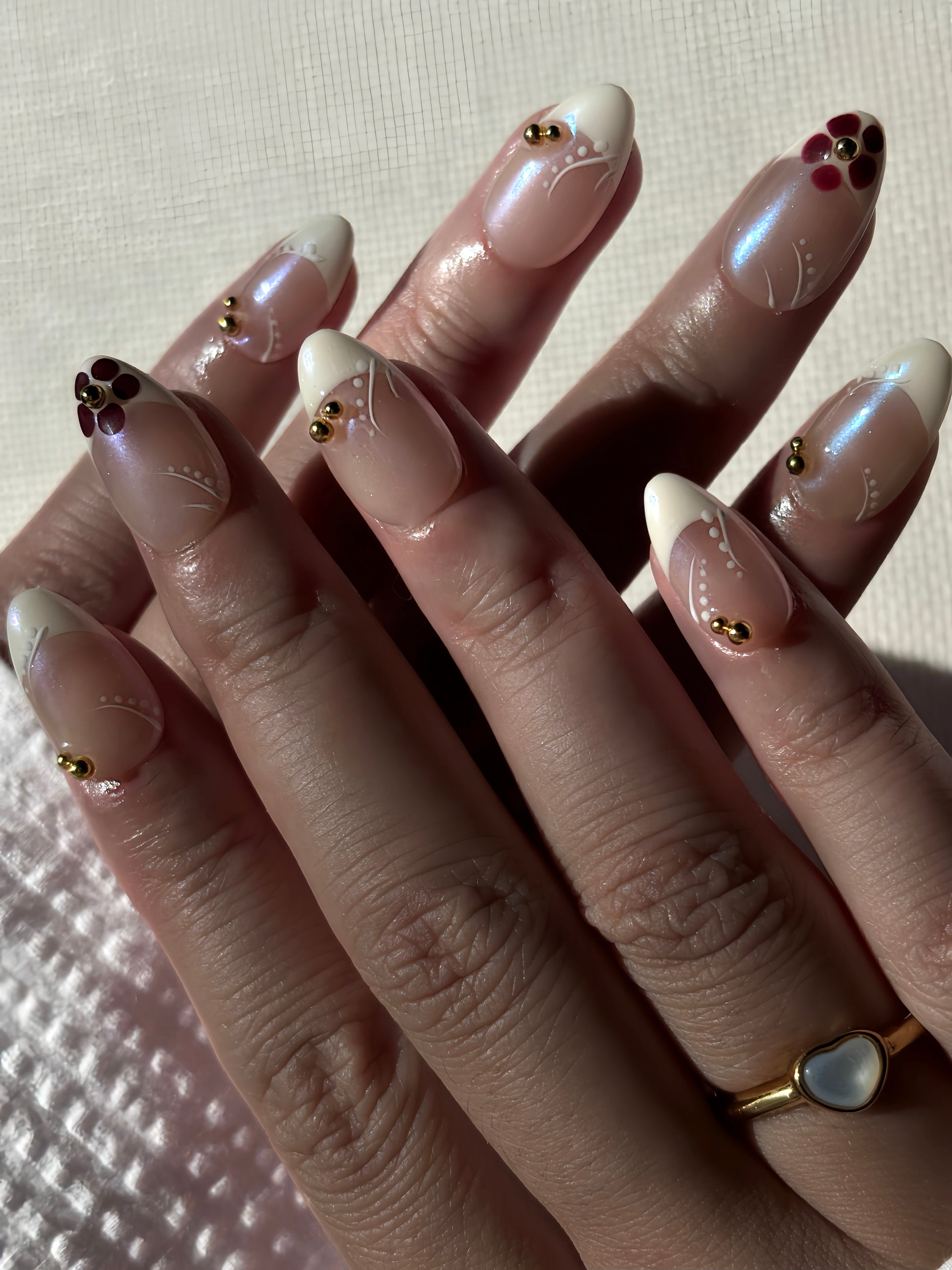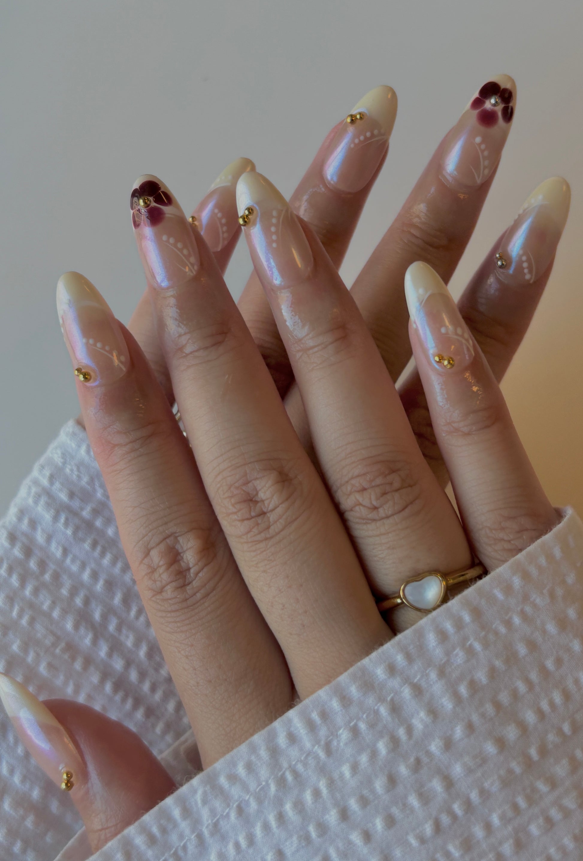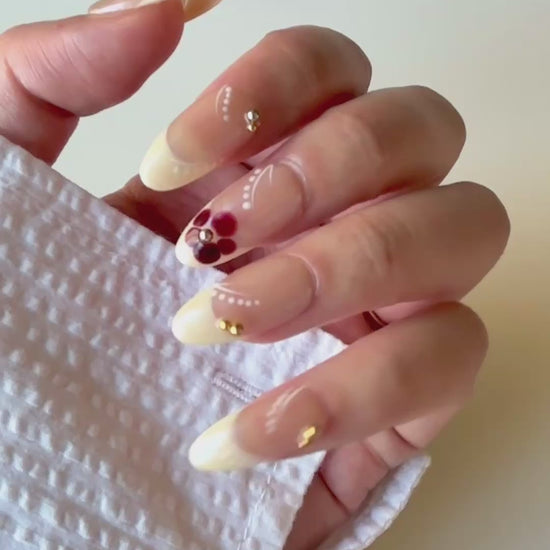 A trendy twist on the classic French: this butter yellow chrome nails set features pearly tips, gold accents, and floral details.