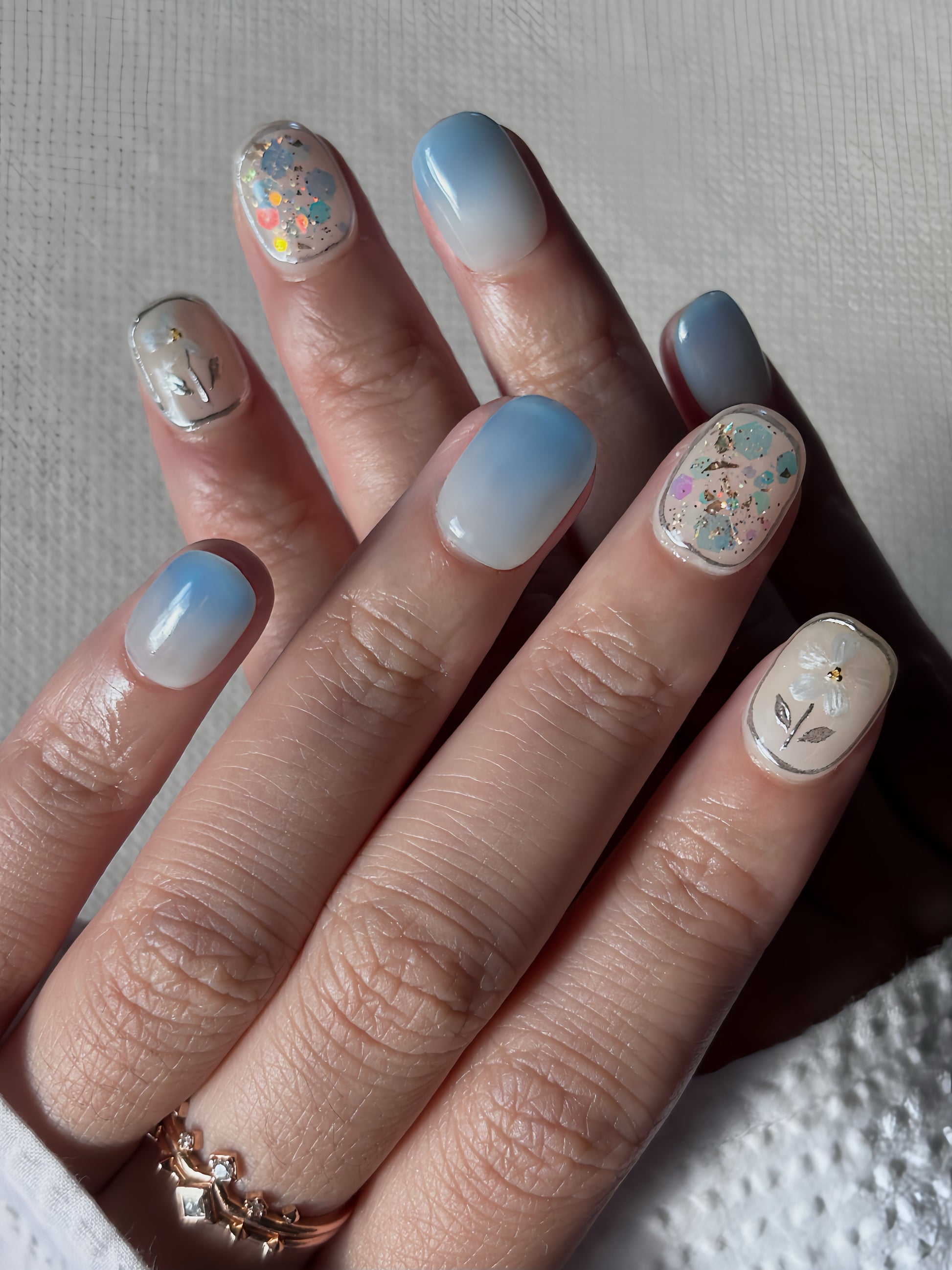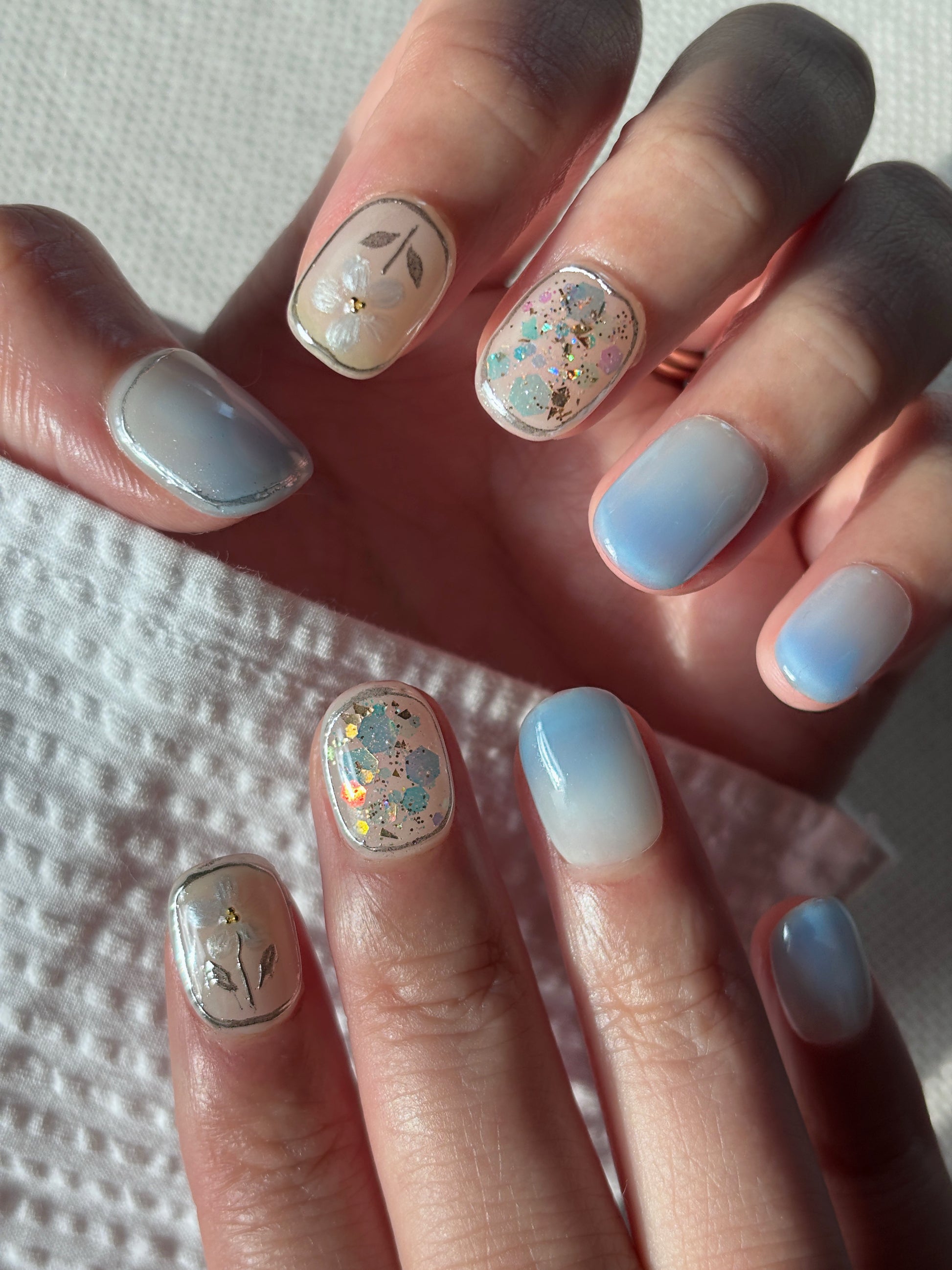 The shortest press-on nails on the market—soft blue ombre, floral accents, and sparkly confetti for the perfect summer nail. Comfy, cute, and made for everyday wear.